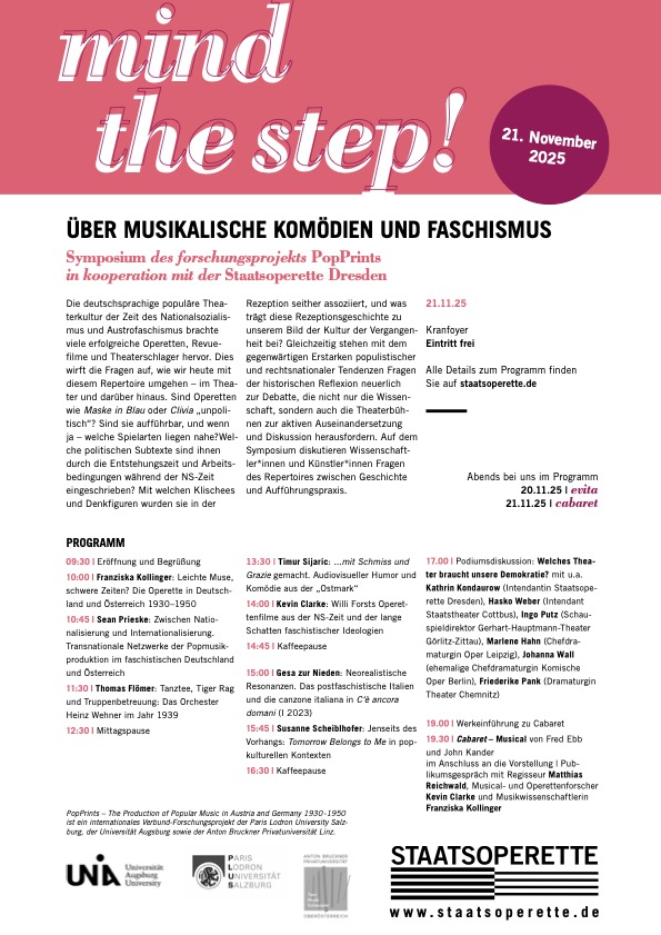 Am 21. November findet in den Räumen der Staatsoperette Dresden das Symposium Mind the Step! Über musikalische Komödien und Faschismus statt, das Franziska Kollinger im Rahmen des PopPrints-Projekts in Kooperation mit der Staatsoperette Dresden organisiert.